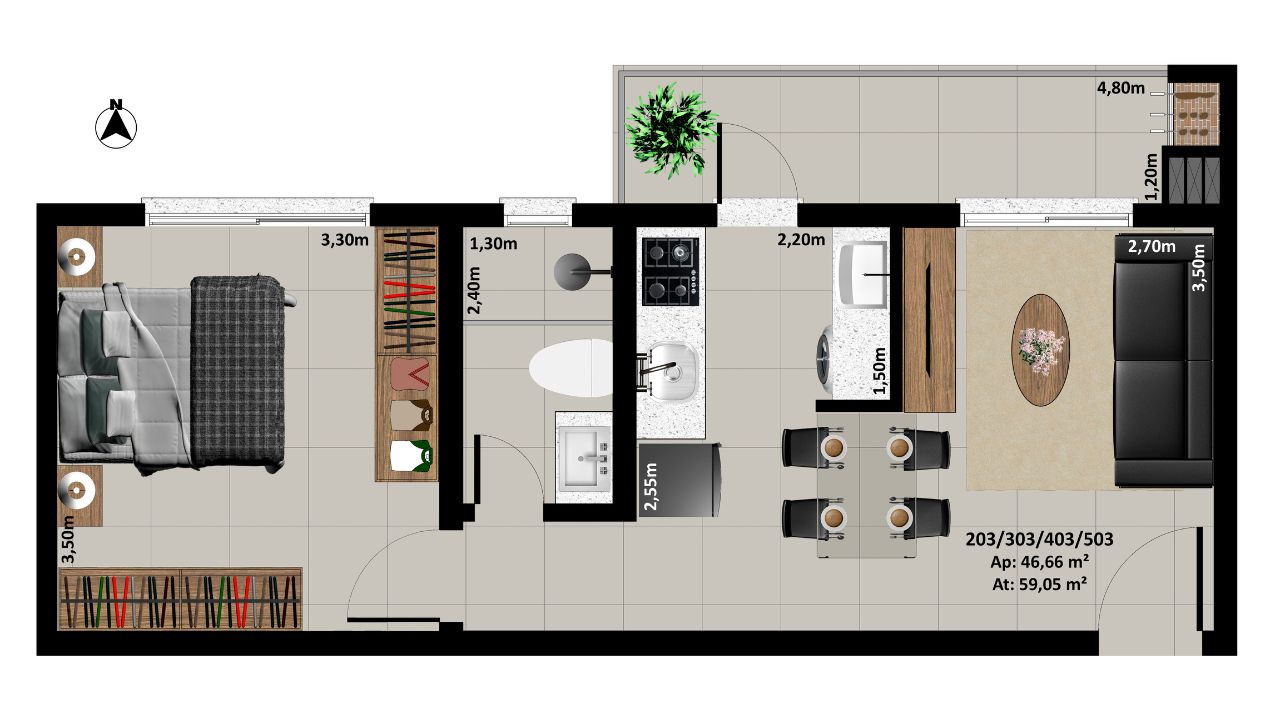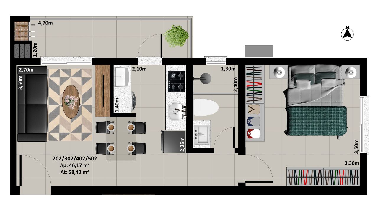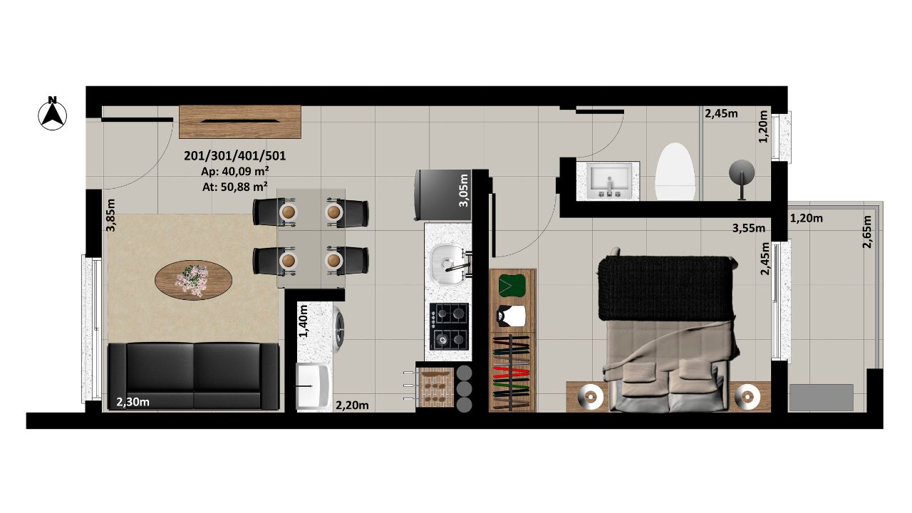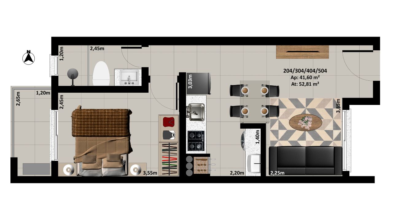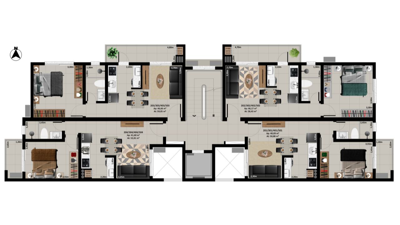 O Botânica Residence é composto por 16 unidades com áreas privativas que variam de 40,09 a 46,66 m².